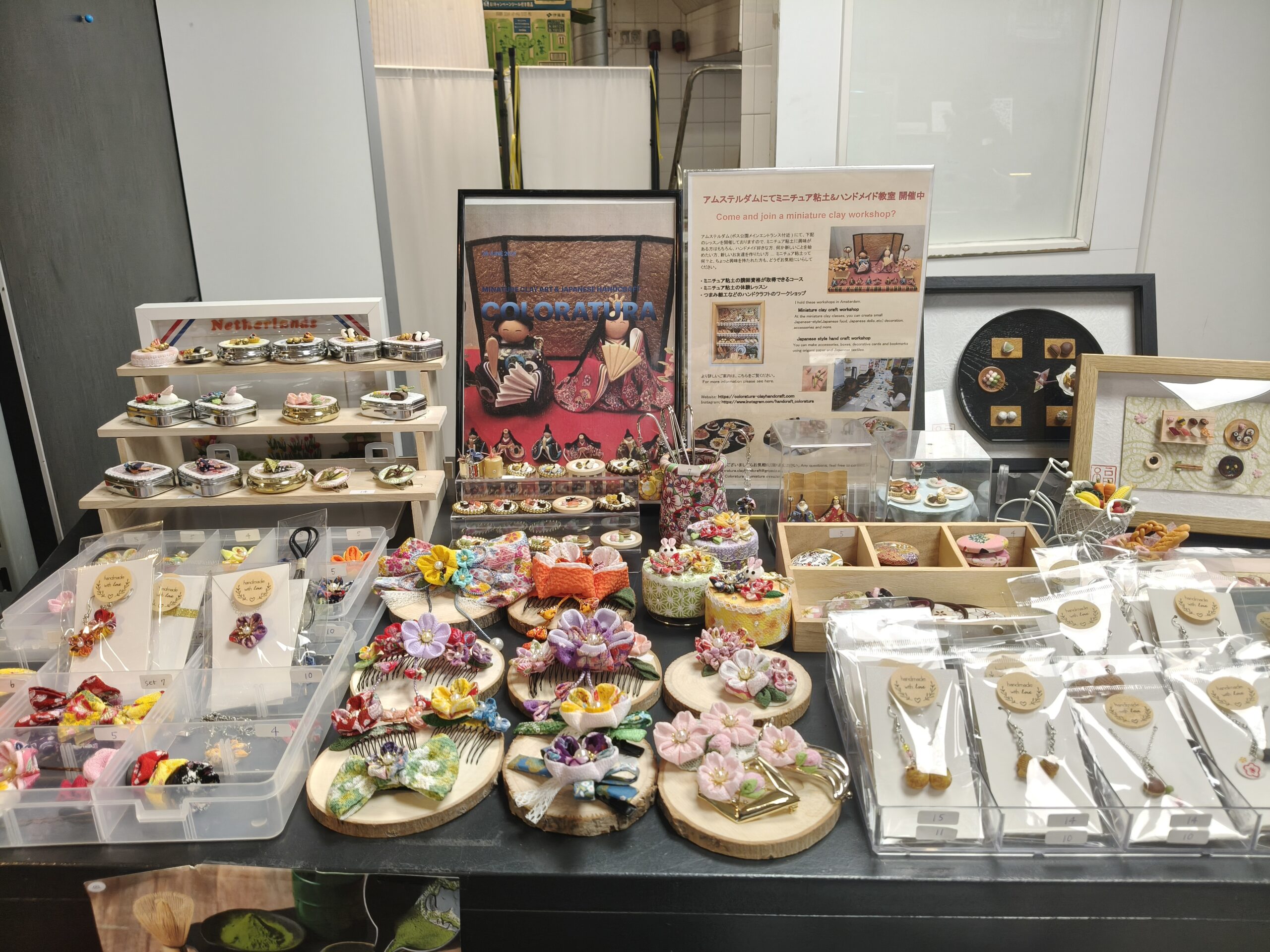 I’ll be bringing a selection of handmade miniature clay pieces, including tiny takoyaki accessories, Japanese sweets, and taiyaki, as well as tsumami-zaiku accessories (traditional Japanese fabric flowers) and other small handcrafted items. Every piece is carefully made by hand, one at a time.