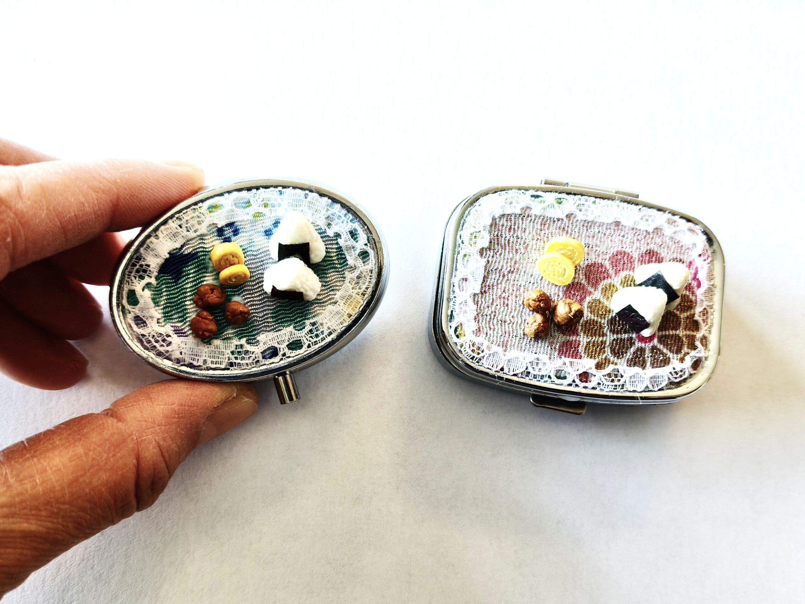 ① ミニチュア粘土「おにぎり、唐揚げ、卵焼きミニケース」